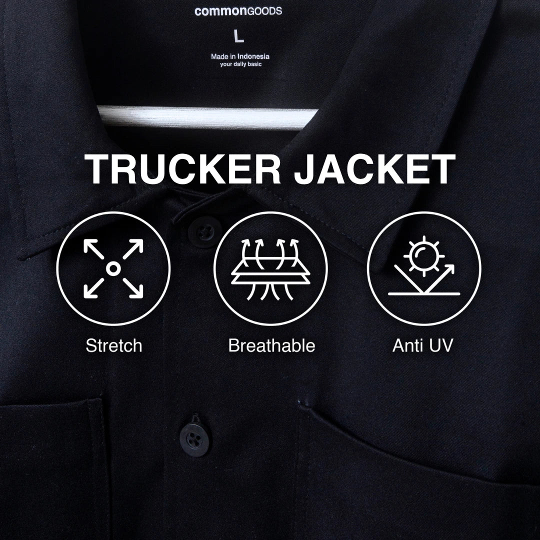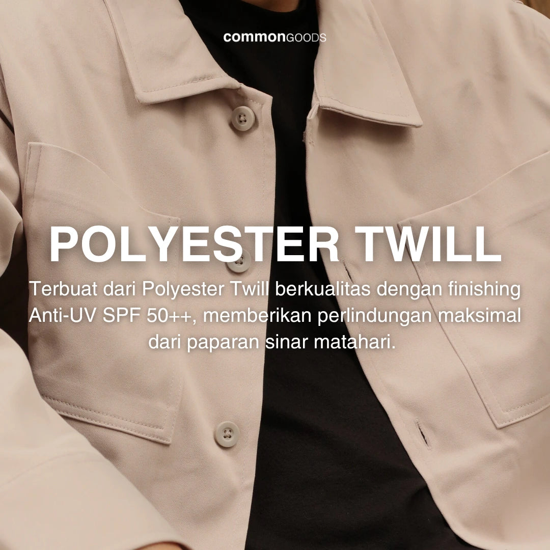 Trucker Jacket Common Goods hadir dengan karakter bahan Polyester Twill yang memiliki tekstur halus, ringan, dan tidak mudah kusut, menjadikannya nyaman dipakai sehari-hari tanpa perlu khawatir tampilan cepat berantakan. Dengan relaxed fit, jaket ini memberikan siluet modern yang tetap terlihat rapi, cocok dipadukan dengan berbagai gaya casual hingga semi-formal.